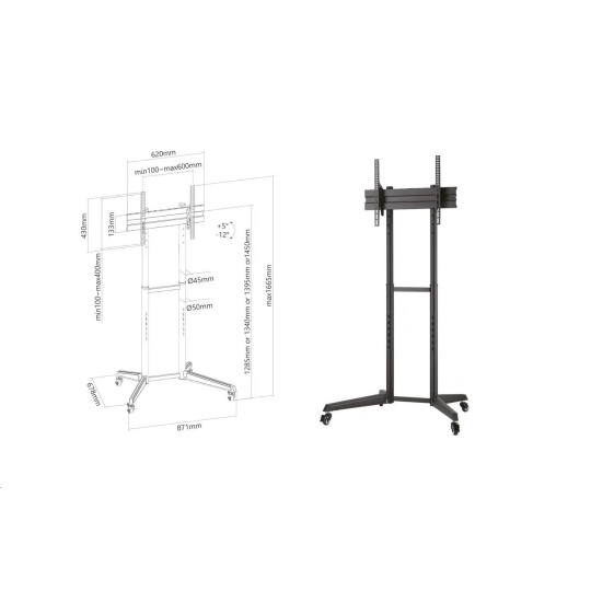 Tv stojan s kolieskami, nastavením výšky a náklonu, na televízie 37" - 70", výška 1285 / 1340 / 1395 / 1450 mm, náklon +5° / -12°, kolieska s aretáciou, podstava 871x678 mm, systém pre vedenie káblov, inštalačný materiál, podporuje štandardy VESA 100x100 až 600x400, nosnosť 50 kg Kvalitný stojan na televízie a monitory s naklápateľnými kolieskami a nastavením výšky Fiber Mounts LUTAR-1 Potrebujete dať televíziu alebo monitor na pojazdný stojan a nechcete míňať veľa peňazí? Chcete mať možnosť upraviť si výšku obrazovky a zmeniť uhol sklonu? Tak v tom prípade pre vás máme skvelé riešenie: televízny stojan Fiber Mounts LUTAR-1, ktorý splní všetko na 100%. Pojazdný stojan s kvalitnými kolieskami s aretáciou, s výbornou stabilitou, ktorý podporuje štandardy VESA od 100x100 do 600x400 a spoľahlivo unesie zariadenie s hmotnosťou až 50 kg vám umožní upraviť výšku aj náklon obrazovky. Konštrukcia umožňuje skryté vedenie káblov. Kvalitná vypalovaná čierna farba. V balení nájdete montážny materiál. Na stojan poskytujeme záruku 5 rokov. Pojazdný stojan s nastavením výšky a náklonu TV / monitoru Fiber Mounts LUTAR-1 Technické údaje: nosnosť 50 kg podpora VESA 100x100 až 600x400 držiak na televízie / monitory 37" - 70" nastaviteľná výška 1285 mm / 1340 mm / 1395 mm / 1450 mm nastavenie náklonu obrazovky +5° / -12° podstava 871x678 mm pojezdové kolieska s aretáciou systém pre skryté vedenie káblov kvalitná konštrukcia farebné vyhotovenie čierne záruka 5 rokov