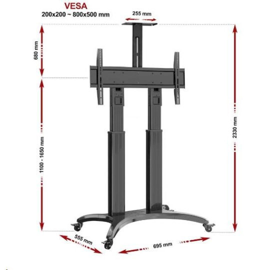 Televízny stojan na videokonferencie NB AVF1800B Profesionálny stojan na televízory a monitory 50-90", ideálny na videokonferencie alebo prezentácie, výškové nastavenie 110-165cm, policka na kameru, pojazdný, nosnosť 56,8kg Televízny stojan ideálny na videokonferencie alebo prezentácie - vhodný na zavesenie televízorov alebo monitorov s uhlopriečkou 50-90" a nastavenie do požadovanej výšky od 110cm do 165cm (výška po stred obrazovky). Na umiestnenie kamery je na stojane polohovateľná policka s rozmermi 255x125mm a nosnosťou 4,5kg. Stojan vyniká kvalitou, dizajnom a jednoduchým nastavením. Všetku kabeláž je možné viesť skryto telom stojanu. Vyrobený je z hliníka, kolieska sú osadené brzdou. Farebné prevedenie čierne, záruka 5 rokov. Televízny stojan na videokonferencie NB AVF1800B Technické údaje: nosnosť 56,8kg na televízie a monitory 50-90" podporuje VESA štandardy 200x100 až 800x400 plynulé nastavenie rozsahu výšky 1100 - 1650mm (výška od podlahy po stred obrazovky) horná policka na kameru 255x125mm, nosnosť 4,5kg systém na skryté vedenie kabeláže hliníková konštrukcia aj podstava profesionálne pojazdové kolieska, všetky sú osadené brzdou najvyššia kvalita, jednoduché nastavenie, maximálna bezpečnosť farebné prevedenie čierne záruka 5 rokov Stojan na videokonferencie, prednášky a propagácie s nastavením výšky TV 110-165cm NB AVF1800BStojan na televízie a monitory NB AVF1800B je dodávaný vrátane hornej policiek na kameru s nosnosťou 4,5kg Tv stojany AVF1800B podporujú VESA štandardy: VESA 200x100 VESA 200x200 VESA 300x200 a 200x300 VESA 300x300 VESA 400x200 a 200x400 VESA 400x300 a 300x400 VESA 400x400 VESA 600x200 VESA 600x300 VESA 600x400 VESA 800x400 VESA 800x500 Stojany na TV NB AVF1800B sú ideálne na využitie na videokonferenciách, prednáškach alebo propagáciách. Svoje využitie našli predovšetkým vo firmách, školách, na výstavách ale aj pre súkromné účely v domácnostiach.
