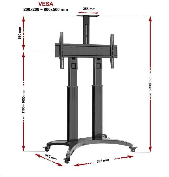 Televízny stojan na videokonferencie NB AVF1800B Profesionálny stojan na televízory a monitory 50-90", ideálny na videokonferencie alebo prezentácie, výškové nastavenie 110-165cm, policka na kameru, pojazdný, nosnosť 56,8kg Televízny stojan ideálny na videokonferencie alebo prezentácie - vhodný na zavesenie televízorov alebo monitorov s uhlopriečkou 50-90" a nastavenie do požadovanej výšky od 110cm do 165cm (výška po stred obrazovky). Na umiestnenie kamery je na stojane polohovateľná policka s rozmermi 255x125mm a nosnosťou 4,5kg. Stojan vyniká kvalitou, dizajnom a jednoduchým nastavením. Všetku kabeláž je možné viesť skryto telom stojanu. Vyrobený je z hliníka, kolieska sú osadené brzdou. Farebné prevedenie čierne, záruka 5 rokov. Televízny stojan na videokonferencie NB AVF1800B Technické údaje: nosnosť 56,8kg na televízie a monitory 50-90" podporuje VESA štandardy 200x100 až 800x400 plynulé nastavenie rozsahu výšky 1100 - 1650mm (výška od podlahy po stred obrazovky) horná policka na kameru 255x125mm, nosnosť 4,5kg systém na skryté vedenie kabeláže hliníková konštrukcia aj podstava profesionálne pojazdové kolieska, všetky sú osadené brzdou najvyššia kvalita, jednoduché nastavenie, maximálna bezpečnosť farebné prevedenie čierne záruka 5 rokov Stojan na videokonferencie, prednášky a propagácie s nastavením výšky TV 110-165cm NB AVF1800BStojan na televízie a monitory NB AVF1800B je dodávaný vrátane hornej policiek na kameru s nosnosťou 4,5kg Tv stojany AVF1800B podporujú VESA štandardy: VESA 200x100 VESA 200x200 VESA 300x200 a 200x300 VESA 300x300 VESA 400x200 a 200x400 VESA 400x300 a 300x400 VESA 400x400 VESA 600x200 VESA 600x300 VESA 600x400 VESA 800x400 VESA 800x500 Stojany na TV NB AVF1800B sú ideálne na využitie na videokonferenciách, prednáškach alebo propagáciách. Svoje využitie našli predovšetkým vo firmách, školách, na výstavách ale aj pre súkromné účely v domácnostiach.