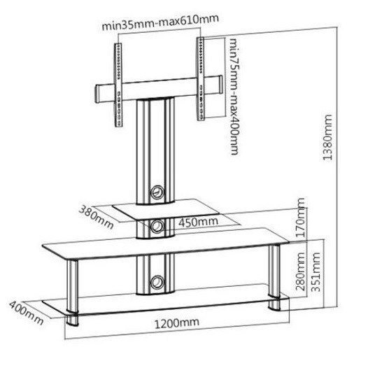 Televízny stolík s držiakom Tv Fiber Mounts M6C26 Televízny stolík s držiakom na Tv 37-60", 2 police 1200x400mm, horná polička 450x380mm, VESA 100x100 až 600x400, výška 1180mm, nosnosť 40kg Štýlový televízny stolík s držiakom na zavesenie televízorov s uhlopriečkou 37-60", výška Tv 1180mm, vrátane 3 sklenených políc na príslušenstvo k Tv z tvrdeného bezpečnostného skla v čiernom lesklom prevedení, rozmer 2 police 1200x400mm, nosnosť 15kg, rozmer vrchnej police 450x380mm, nosnosť 5kg. Systém pre skryté vedenie káblov, držák s podporou VESA 100x100 až 600x400 a nosnosťou 40kg. Ideálny do obývacích alebo detských izieb, spální, kancelárií a konferenčných miestností. Kvalitný štýlový televízny stolík Fiber Mounts M6C26 Technické údaje: nosnosť 40kg podpora VESA štandardu 100x100 až 600x400 na televízie s uhlopriečkou 37-60" celková výška vrátane držiaka 1380mm výška po stred obrazovky 1180mm celková šírka 1200mm rozmer menšej police: 450x380mm, nosnosť 5kg rozmer dolných police: 1200x400mm, nosnosť 15kg systém pre skryté vedenie káblov vynikajúca kvalita materiál: hliník + tvrdené bezpečnostné sklo inštalačný materiál záruka 2 roky Televízny stolík vrátane držiaka na televíziu s uhlopriečkou 37-60 palcov Fiber Mounts M6C26 Televízny stolík M6C26 s držiakom Tv podporuje VESA štandardy: VESA 100x100 VESA 200x100 a 100x200 VESA 200x200 VESA 300x100 a 100x300 VESA 300x200 a 200x300 VESA 300x300 VESA 400x200 a 200x400 VESA 400x300 a 300x400 VESA 400x400 VESA 500x300 VESA 600x400 Na televízny stolík Fiber Mounts F62M6 je možné zavesiť všetky typy (LCD, LED, OLED, plazma, 3D, Smart, Ultra HD) a značky (SONY, Panasonic, LG, Samsung, Orava, Hyundai, Philips, Hitachi, atď.) televízorov, ktoré podporujú ktorúkoľvek z vyššie uvedených VESA štandardov.