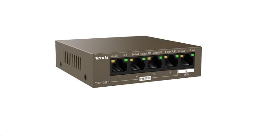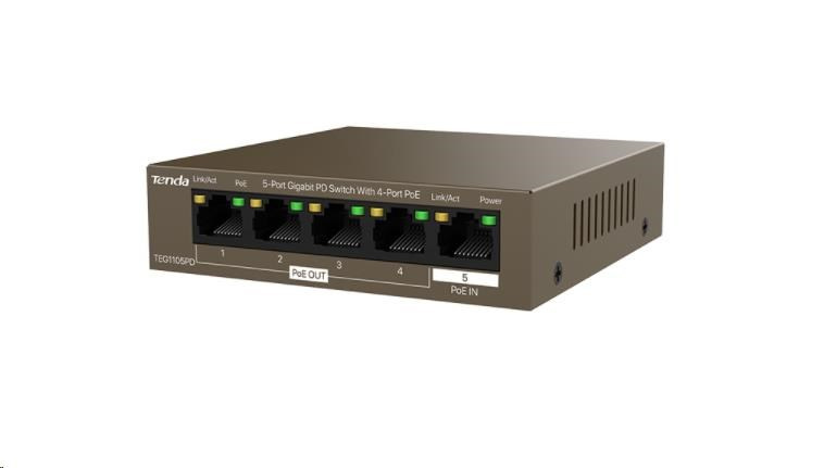 Tenda TEG1105PD - 5-portový PoE PD Gigabit Ethernet Switch, 1x PoE IN, 4x PoE OUT, kovový, bez ventilátora