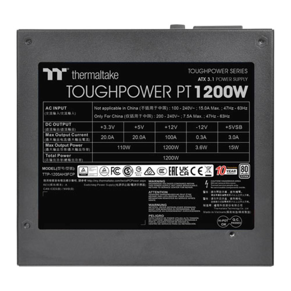 Toughpower PT 1200W Platinum je kompatibilný s ATX 3.1, má certifikáciu 80 PLUS Platinum a podporuje nativné PCIe Gen 5.1 (12+4pin) pre napájanie novej generácie grafických kariet. Poskytuje 1200 W nepřetržitého výkonu pri 40 °C.