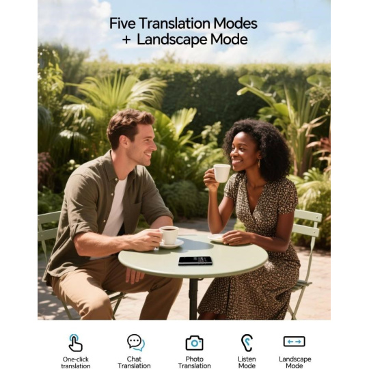 Timekettle T1 ponúka pôsobivú sadu prekladových režimov prispôsobených pre každý scenár. Zažite neprerušované konverzácie 1:1 v reálnom čase alebo zapojte viac účastníkov s intuitívnym režimom prekladu chatových konverzácií. Pre vizuálne porozumenie vstavaná 8Mpx kamera umožňuje okamžitý preklad fotografií, vďaka čomu môžete jednoduchým kliknutím porozumieť nápisom, jedálnym lístkom a dokumentom. Navyše inteligentný režim počúvania prekladá všetko, čo počuje, a poskytuje nepretržitý tok porozumenia v dynamickom prostredí. Spolu s veľkým, živým displejom zabezpečuje Timekettle T1, že každá interakcia je jasná, presná a ľahko zrozumiteľná.
