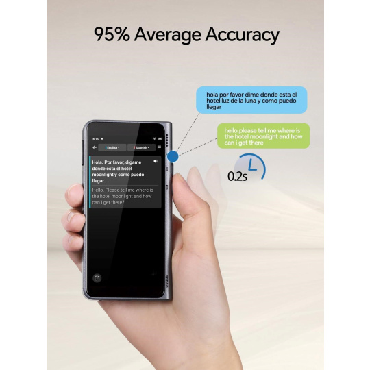 Neztrácejte ani vteřinu! S Timekettle T1 zažijete preklad s neuveriteľne rýchlou reakčnou dobou iba 0,2 sekundy, čo zaručuje plynulé a prirodzené konverzácie bez zbytočných oneskorení. Vďaka špičkovým algoritmom a pokročilej technológii LLM dosahuje zariadenie priemernú presnosť prekladu až 95 %, takže sa môžete spoľahnúť na zrozumiteľnosť a správnosť každej vety. Komunikujte sebavedome a efektívne s istotou, že vám nič neunikne.
