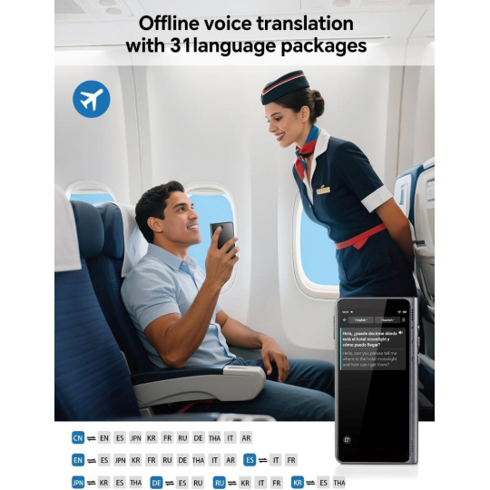 - Už žiadne jazykové bariéry, ani offline. Vďaka technológii AI Edge-Model a 31+ offline jazykovým balíkom prekladá spoľahlivo aj bez pripojenia k internetu.