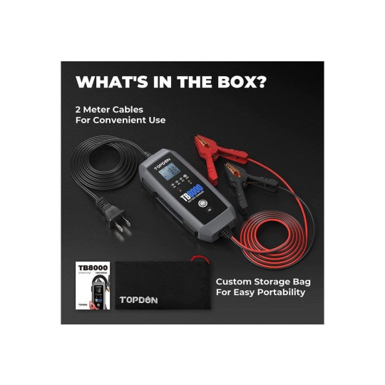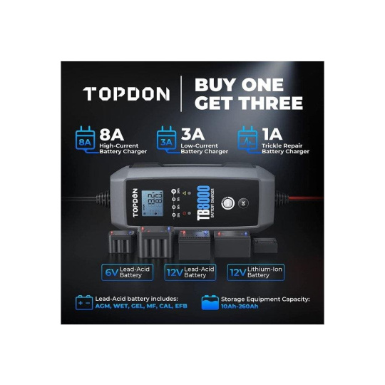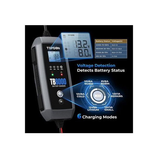 Nabíjačka batérií TOPDON TB8000 ponúka dva nabíjacie prúdy 8A a 3A pre batérie od 15Ah do 260Ah. S týmto jedinečným nástrojom budete môcť nabíjať batérie v automobiloch, motocykloch, jachtách, nákladných vozidlách, SUV, MPV, traktoroch a mnohých ďalších. Vďaka 6-tím nabíjacím režimom, 12V/8A Norm, 12V/8A Cold, 12V/8A Lithium, 12V/3A Small Norm, 6V/8A Norm a 12V Repair, si vyberiete ten, ktorý bude najviac vyhovovať Vašim potrebám!