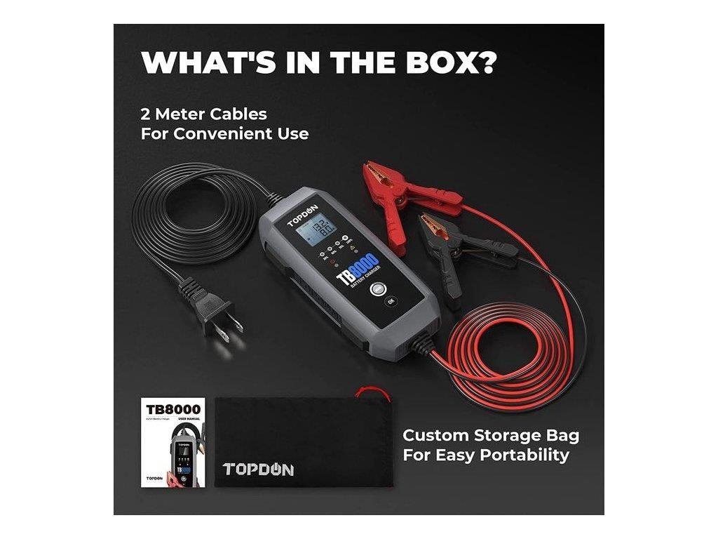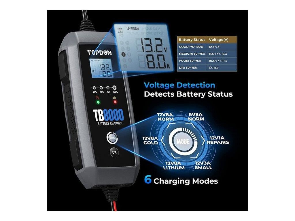 9stupňový systém inteligentného nabíjania TB8000 poskytuje používateľom špičkovú technológiu, ktorá automaticky identifikuje stav batérie a dodáva najvhodnejší prúd. S týmto zariadením sa už nemusíte obávať poškodenia batérií!