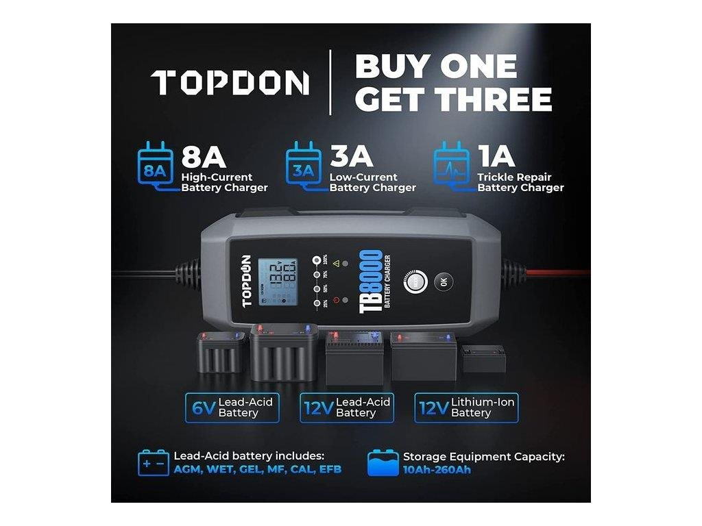 Nabíjačka batérií TOPDON TB8000 ponúka dva nabíjacie prúdy 8A a 3A pre batérie od 15Ah do 260Ah. S týmto jedinečným nástrojom budete môcť nabíjať batérie v automobiloch, motocykloch, jachtách, nákladných vozidlách, SUV, MPV, traktoroch a mnohých ďalších. Vďaka 6-tím nabíjacím režimom, 12V/8A Norm, 12V/8A Cold, 12V/8A Lithium, 12V/3A Small Norm, 6V/8A Norm a 12V Repair, si vyberiete ten, ktorý bude najviac vyhovovať Vašim potrebám!