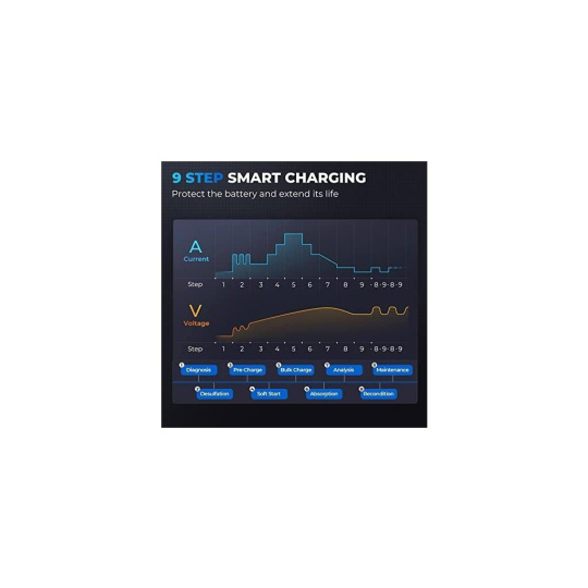 9stupňové inteligentné nabíjanie poskytuje silnú ochranu batérie a automatický systém odpojenia eliminuje riziko prebíjania. Používajte režimy NORM (bežné)/COLD (v chlade)/REPAIR (oprava), aby ste sa prispôsobili potrebám vašej batérie a tým predĺžili jej životnosť.