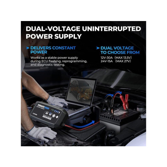 TORNADO30000 je vytvorená na osobné aj komerčné použitie. Dokáže oživiť, opraviť a nabiť ako lítiové, tak olovené akumulátory. Takisto však môže slúžiť ako stabilný napájací zdroj pri opravách, testovaní alebo diagnostike vozidla bez nutnosti štartu motora.