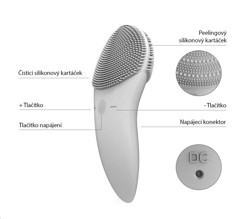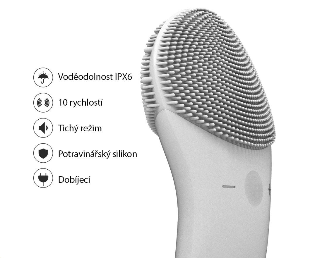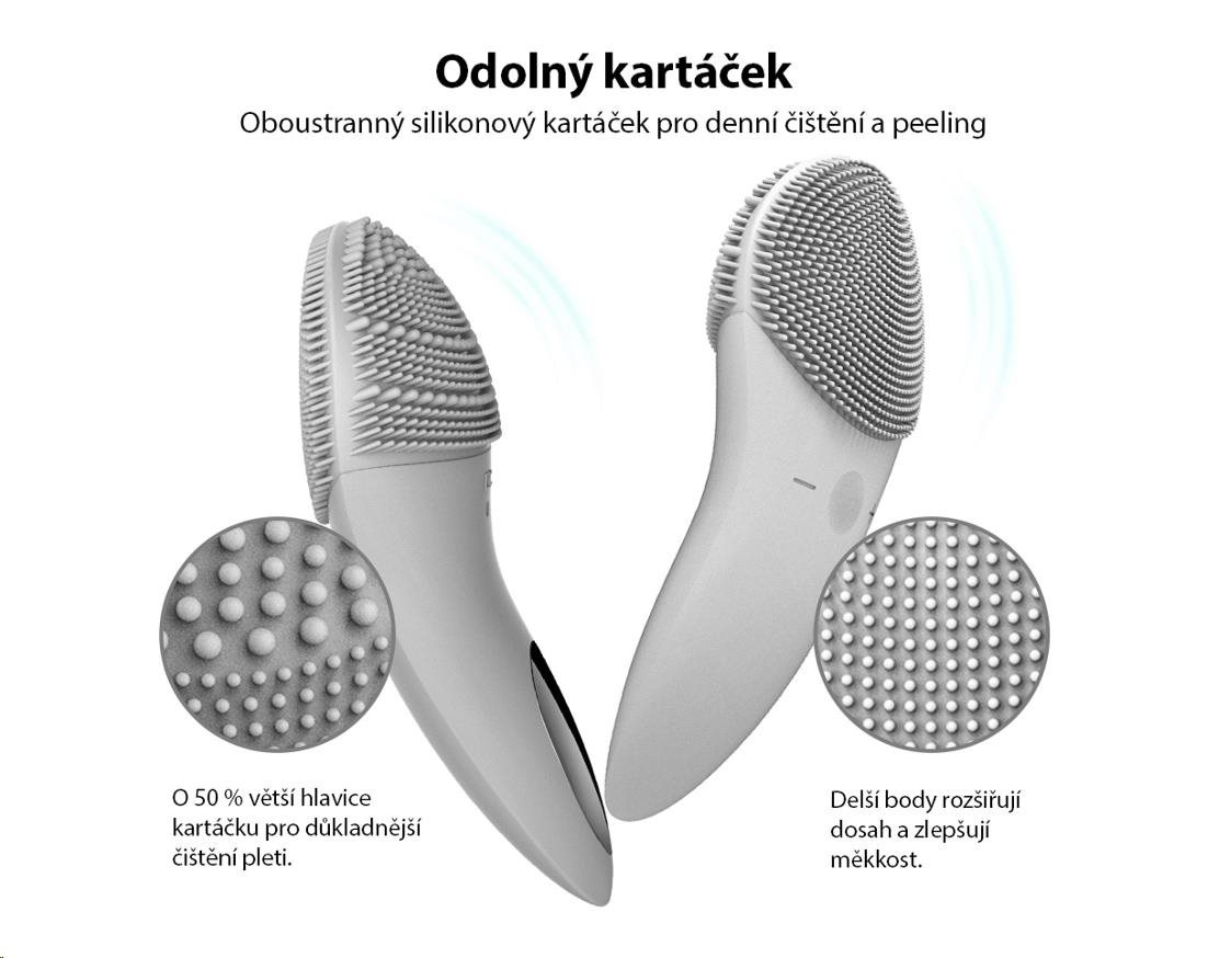 Každodenná čistiace plocha je vybavená jemnými silikónovými dotykovými bodmi, ktoré čistia tvár bez poškodenia pokožky.