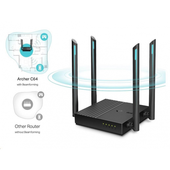 - Smerovač Archer C64 umožňuje pripojiť viac zariadení naraz a súbežne prenášať dáta vďaka podpore dvoch pásiem 2,4 GHz a 5 GHz. Pásmo 2,4 GHz poskytuje spoľahlivé pripojenie na odosielanie e-mailov, prehliadanie webových stránok a ďalšiu jednoduchú aktivitu. Pásmo 5 GHz ponúka rýchlosť až 867 Mb/s, čo je vhodné pre činnosti náročné na prenos dát, ako je napríklad streamovanie videa a hranie hier online.† Vďaka pripojeniu bez zadržania či zasekávania už nikdy o nič neprídete.