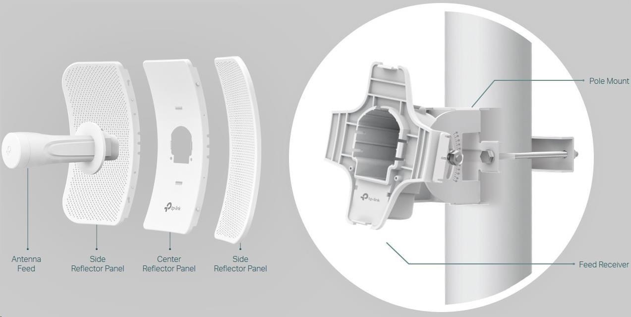 - Inovatívne vzájomne prepojené diely zabezpečujú rýchlu inštaláciu a robustnú konštrukciu, ktorá udržuje stabilitu CPE710 aj pri silnom vetre