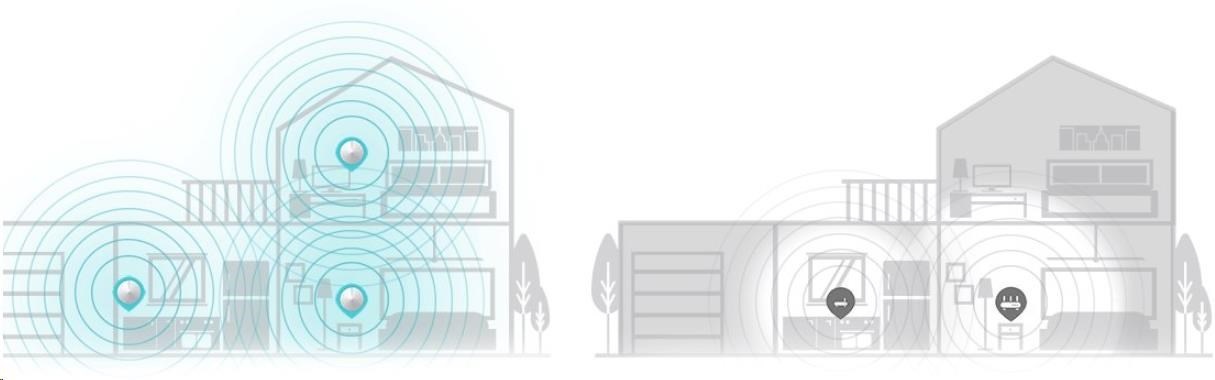 | Dohľad WiFi | Domy na 3-5 izbových (3-pack) TP-Link Mesh technológia Voliteľná Ethernetová spätná väzba spolupracuje na prepojení jednotiek Deco pre bezproblémové pokrytie 4× antény (vnútorné) Viacnásobné antény tvoria zosilňujúce pole, ktoré pokrýva viac smerov a veľké plochy Beamforming Zameriava bezdrôtový signál na klientov, aby rozšíril dosah WiFi |