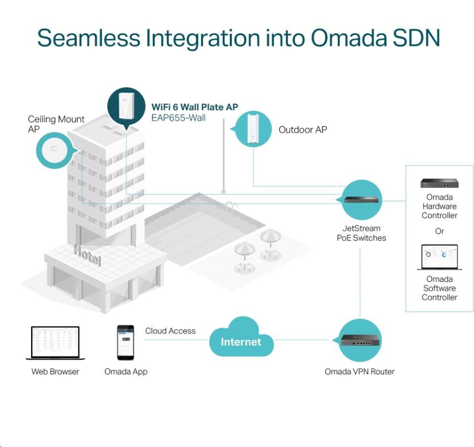 - Koncentrická cloudová správa: Integrácia s platformou Omada SDN umožňuje cloudový prístup a vzdialenú správu.