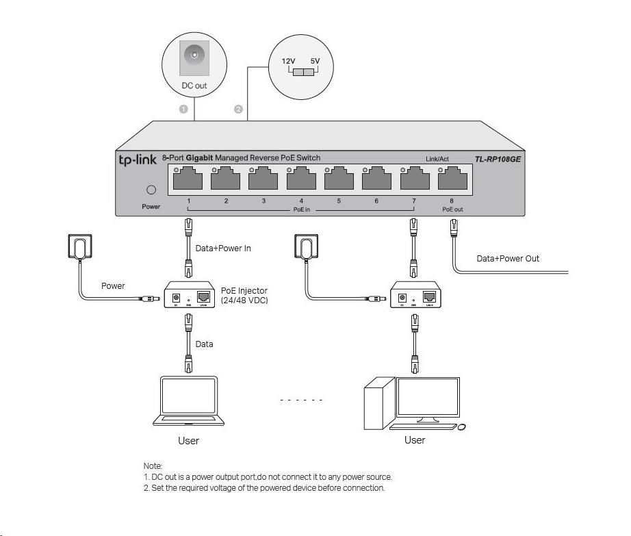 Pasívny PoE switch RP108GE (TL-RP108GE) má sedem gigabitových PoE vstupných portov, ktoré umožňujú získavať elektrickú energiu z používateľských zásuviek pomocou PoE injektorov. Vybavený jedným PoE výstupným portom môže switch napájať CPE alebo podobné zariadenie pomocou Portu 8. Výstupný DC port podporuje obe napätia 5 V a 12 V a možno ho tak použiť na napájanie zariadení ako ONT. Vďaka integrácii prepínania dát a PoE napájania do jedného zariadenia RP108GE šetrí miesto, minimalizuje množstvo káblov a eliminuje potrebu vyhradenej elektrickej zásuvky - čím znižuje náklady na inštaláciu a zjednodušuje inštaláciu PoE zariadení. Poznámka: Vstupné PoE porty podporujú pasívne 24V a 48V PoE injektory. Používajte iba jeden typ injektora, nekombinujte rôzne úrovne napätia. Úroveň napätia výstupného pasívneho PoE portu je zhodná s napätím zvoleného vstupného PoE injektora