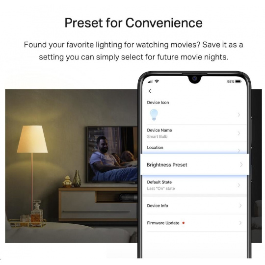 - Stmievateľná (nastavenie pre vaše pohodlie) – Našli ste svoje obľúbené osvetlenie na sledovanie filmov? Uložte ho ako nastavenie, ktoré si môžete ľahko vybrať pre budúce filmové večery.