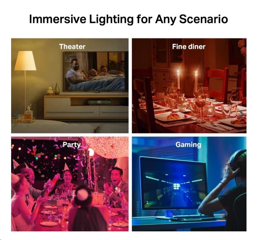 - Vicefarebná – Jednoducho navrhujte scenáre pre svoju každodennú rutinu alebo aktivity prispôsobením jasu, teploty svetla a farieb–s výberom 16 000 000 odtieňov.