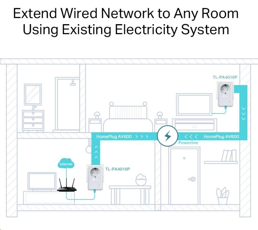 TL-PA4010P KIT, ktorý využíva pokročilú technológiu Home Plug AV, poskytuje stabilný a vysokorýchlostný prenos dát až do rýchlosti 600 Mb/s* pre dosah až do vzdialenosti 300 metrov od miesta, kde je umiestnená sieťová zásuvka. Žiadne rušenie na elektrických alebo elektronických zariadeniach. Streamujte v HD, hráte online a sťahujte veľké súbory bez prerušenia vďaka spoľahlivým napájacim linkám.