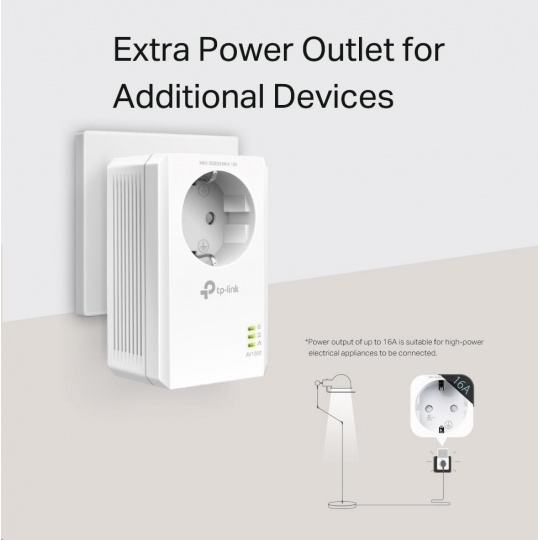 - Kompatibilný so zásuvkami štandardu HomePlug AV2 – vysoká rýchlosť prenosu dát dosahujúca 1 000 Mbit/s uspokojí všetky vaše online aktivity.
