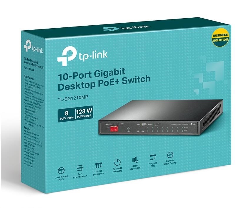 TP-Link CCTV switch TL-SG1210MP (8xGbE, 1xGbE uplink, 1xGbE/SFP combo uplink, 8x PoE+, 123W, fanless)