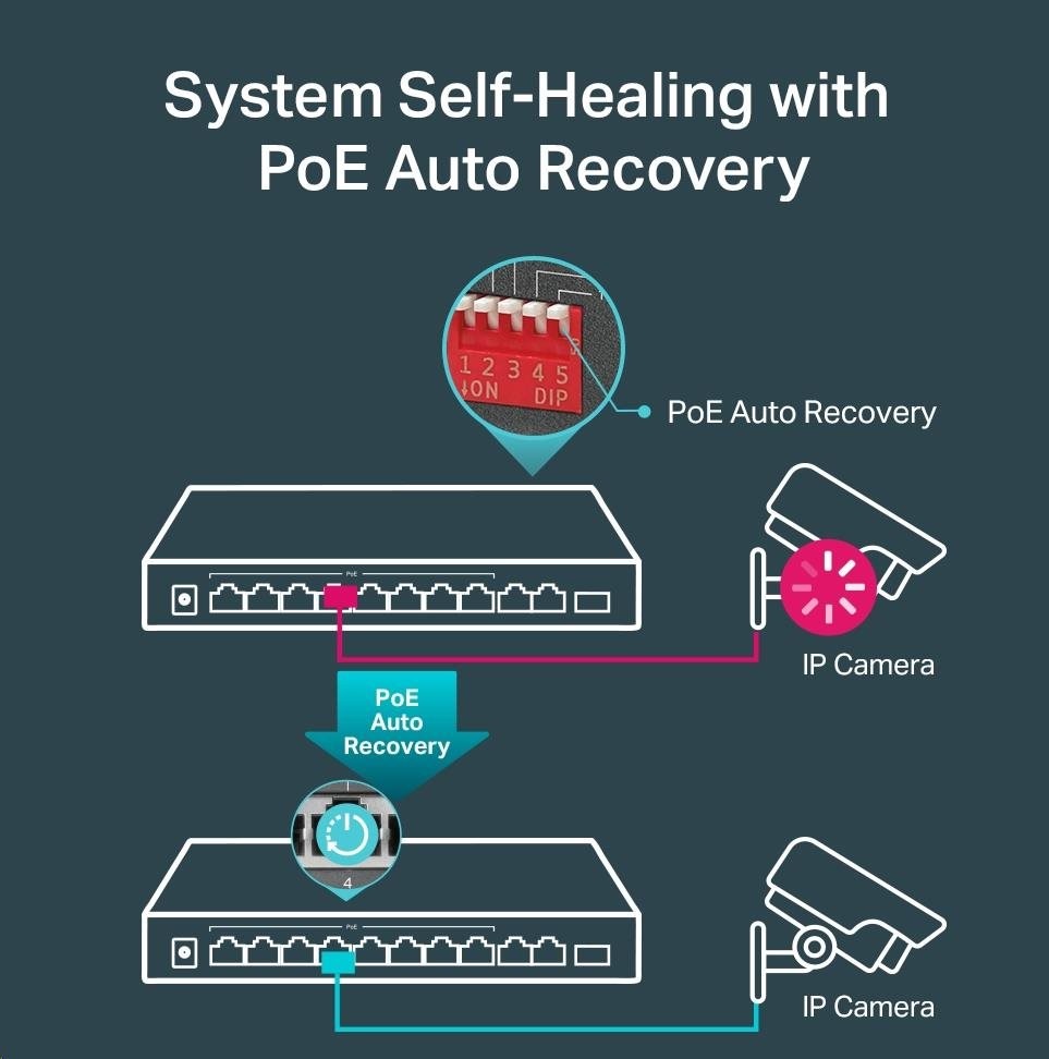 - S funkciou automatického obnovenia PoE automaticky reštartuje vypnuté alebo nereagujúce zariadenia napájané cez PoE.
