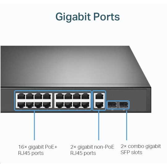 - 16× Gigabit PoE+ RJ45 portov, 2× Gigabit on-PoE RJ45 porty a 2× Combo Gigabit SFP zásuvky