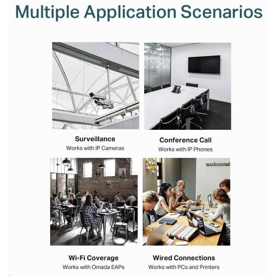 - Prioritný režim pre porty 1-4, ktorý zaručuje kvalitu citlivých aplikácií, ako je napríklad video monitorovanie.