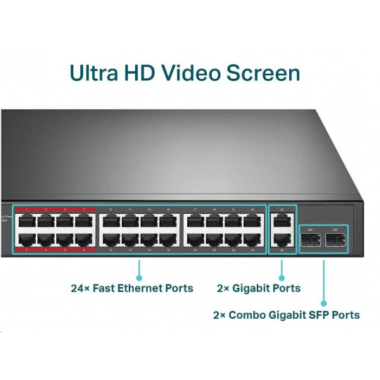 | Rozhranie | 24× PoE+ 10/100 Mbps RJ45 portov 2× 10/100/1000 Mbps RJ45 portov 2× Combo gigabitové SFP sloty |