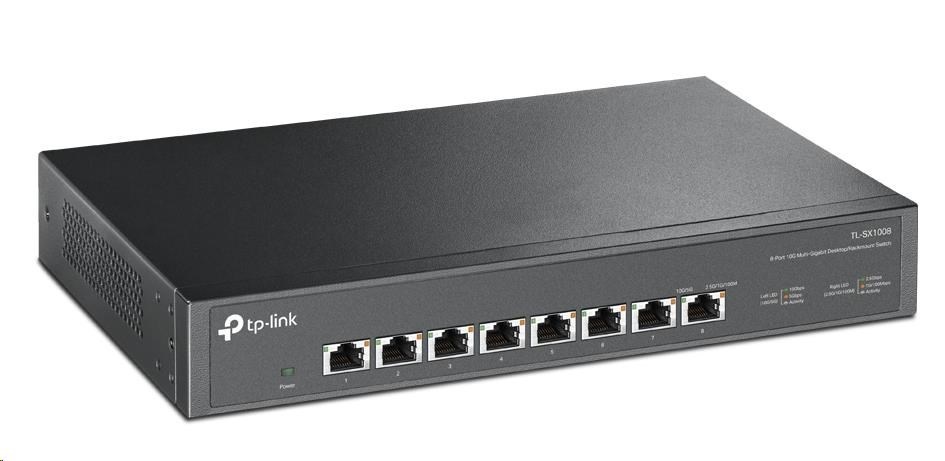 Switch TL-SX1008, ktorý je vlajkovým produktom segmentu 10G, je 8portový stolný/rackový switch 10G s kapacitou prepínania až 160 Gbit/s. Funkcia automatického vyjednávania rýchlosti 5rýchlostného pripojenia (100 Mbit/s / 1G / 2.5G / 5G / 10G) monitoruje rýchlosť pripojenia a inteligentne ju prispôsobuje pre kompatibilitu a optimálny výkon všetkých vašich zariadení, vrátane úložísk NAS 10G, serverov 10G, pracovných staníc, herných počítačov, prístupových bodov 2.5G/5G/10G Wi-Fi 6, 8K videí, stolných počítačov a ďalších aplikácií.