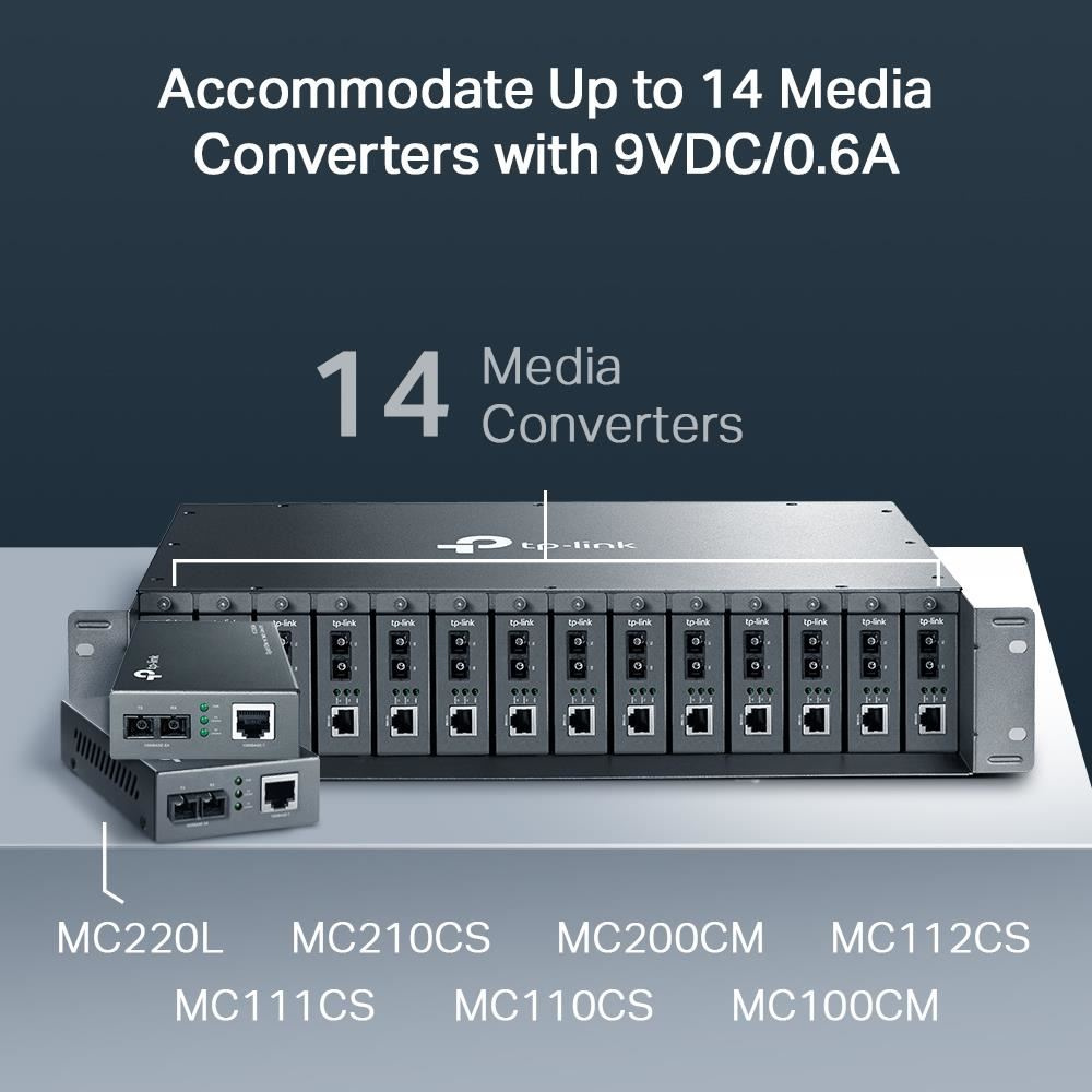 14-pabcové rackové šasi MC1400 je špeciálne určené na osadenie 14 médií konvertorov TP-LINK pri zabezpečení centrálného napájania, úspory miesta a napájacích káblov. Nepretržitý prevádzka je pre komunikáciu cez optické vedenie veľmi dôležitá, preto je možné šasi voliteľne osadiť redundantným napájacím zdrojom TL-MCRP100**. Funkcia výmeny za prevádzky umožňuje inštaláciu/odstránenie konvertora/napájacieho zdroja bez vypnutia napájania šasi. Navyše, pre stabilizáciu prevádzkového výkonu a predĺženie životnosti sú vo vnútri nainštalované dva chladenia ventilátory. Spolu so sériou MC médií konvertorov Gigabit/Fast Ethernet predstavuje zariadenie TL-MC1400 ideálne riešenie pre vašu sieť médií konvertorov.