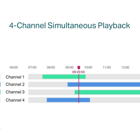 - 4-kanálové simultánne prehrávanie - Prehrávajte záznamy až z 4 kamier súčasne, zvýšte rýchlosť prehrávania a vyhľadajte udalosti v plánovanom videu, aby ste si mohli ľahko pozrieť záznam.
