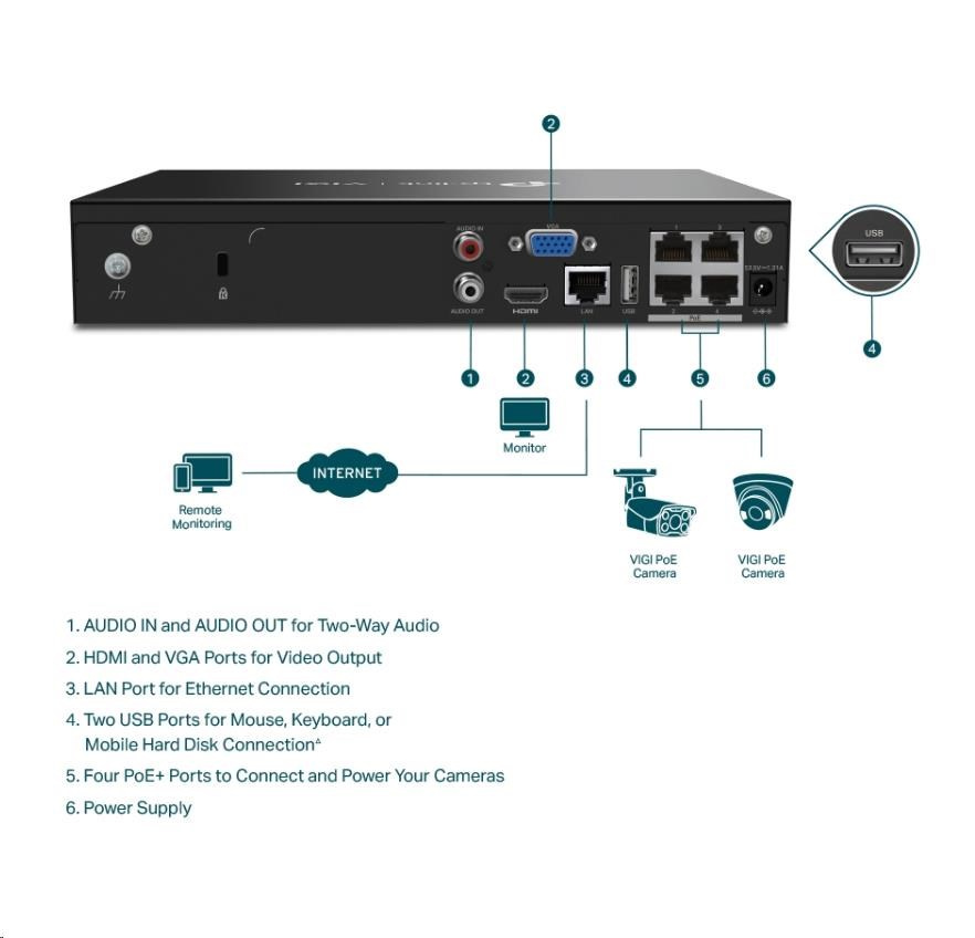 TP-Link VIGI NVR1004H-4P, videorekordér, 4 channels, 4xPoE, 1xSATA, 1x100Mb/s LAN, 2xUSB2.0, 1xHDMI,1xVGA