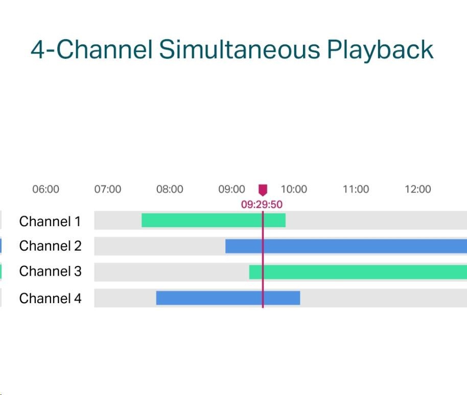 - 4-kanálové simultánne prehrávanie - Prehrávajte záznamy až z 4 kamier súčasne, zvýšte rýchlosť prehrávania a vyhľadajte udalosti v plánovanom videu, aby ste si mohli ľahko pozrieť záznam.