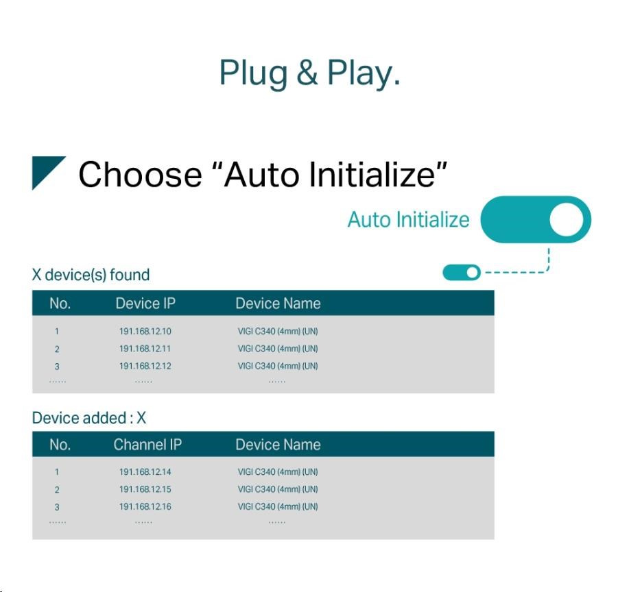 - Plug & Play - Umožňuje automatické pridanie nových a nepoužitých IP kamier VIGI do nového NVR a okamžitú aktiváciu, takže inštalácia je rýchlejšia než kedykoľvek predtým.