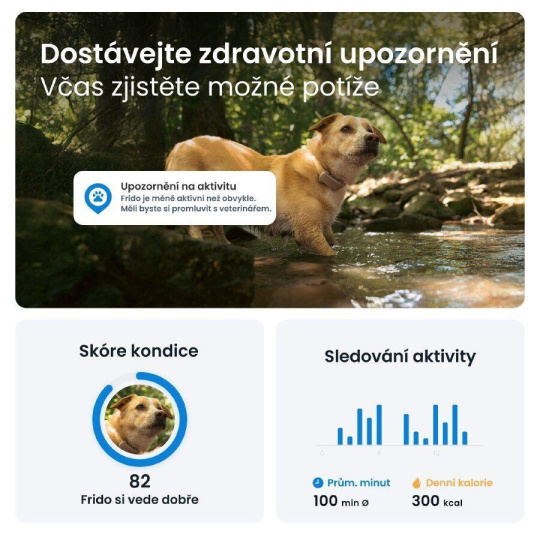 GPS tracker Tractive vás informuje, ako veľmi sa váš pes pohybuje, spí a šteka. Môžete nastaviť ciele pohybu, kontrolovať Skóre kondície a porovnávať svojho psa s inými plemenami.Odolná konštrukcia