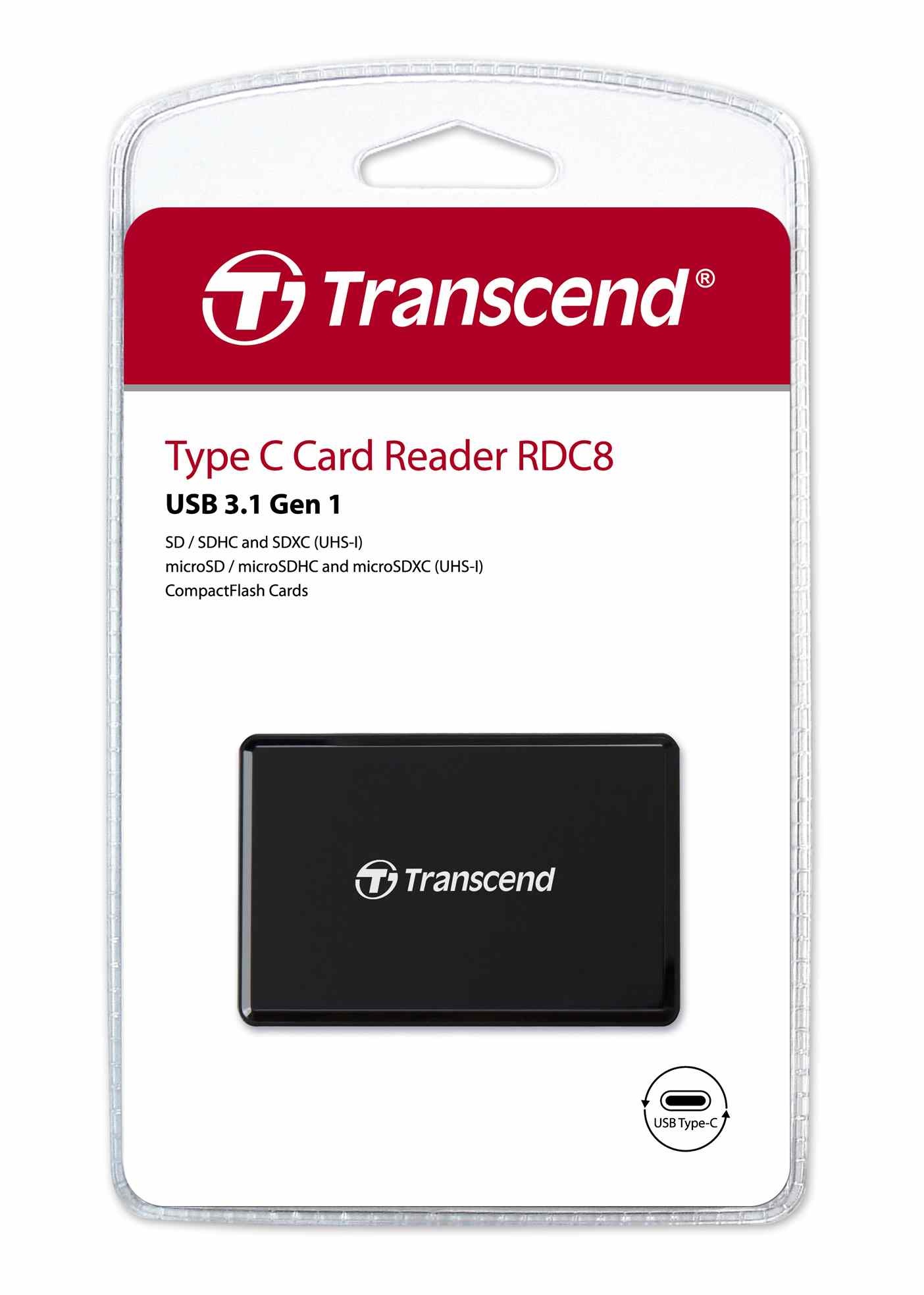 Čítačka kariet RDC8 od spoločnosti Transcend so štyrmi slotmi je určená pre nové počítačové platformy s portom USB typu C, ako sú 12-palcový MacBook od spoločnosti Apple a Chromebook Pixel 2 od spoločnosti Google, a dokáže naplno využiť potenciál väčšiny flash kariet vrátane kariet SD, microSD, CF a Memory Stick (MS). Vybavený USB 3.1 Gen 1, Transcend RDC8 je ideálnou voľbou pre rýchly a efektívny prenos dát z flash karty do notebooku s portami USB typu C.