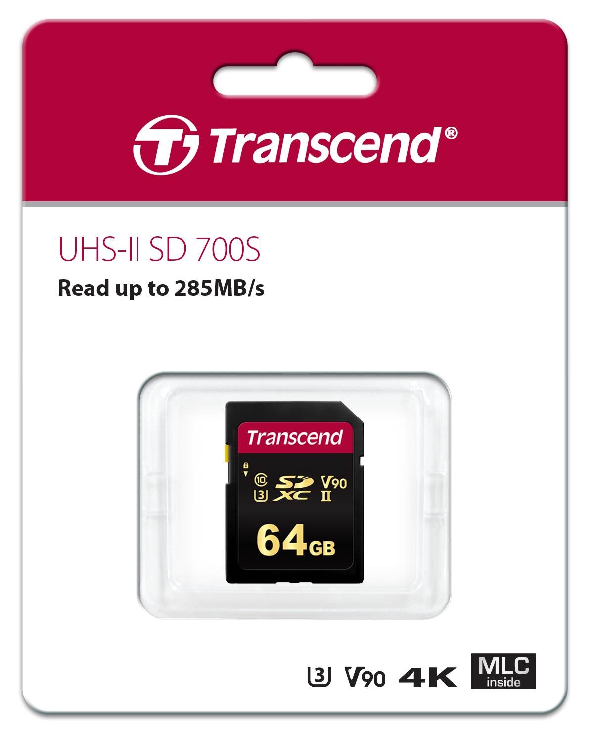 Pamäťové karty Transcend SDXC/SDHC 700S spĺňajú štandardy UHS-II Speed Class 3 (U3) a UHS Video Speed Class 90 (V90) pre videozáznamy v rozlíšení 4K Ultra HD s rýchlosťou čítania/zápisu až 285 MB/s a 180 MB/s.