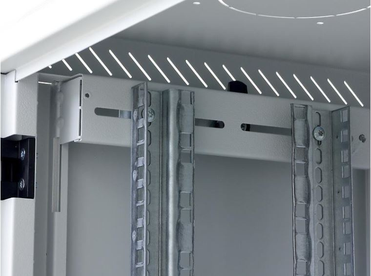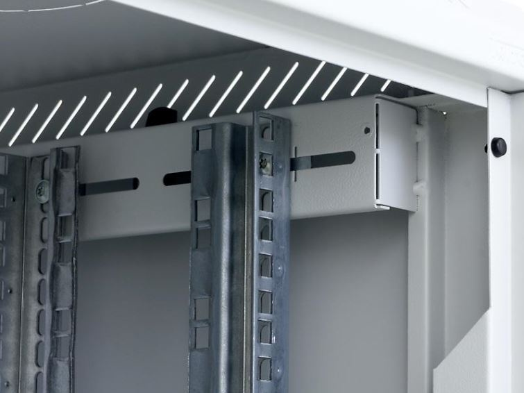 Dva páry 19" vertikálnych koľajníc sú plynule nastaviteľné v ľubovoľnej hĺbke stojana. To uľahčuje inštaláciu zariadenia a usporiadanie pripojovacích káblov.