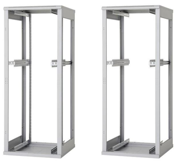 (platí pre šírku stojana 800 mm). Systém umožňuje inštaláciu posuvných vertikálnych koľajníc v rozpätiach 19", 21" a 23", presne podľa požiadaviek inštalovaného zariadenia.