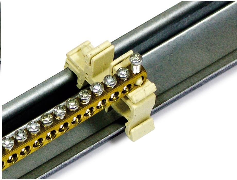 Uzemňovací modul na DIN lište na montáž na 19" vertikálne zariadenia, 36 prípojných bodov do max. prierez 10 mm2, jeden napájací bod do max. prierez 25 mm2..