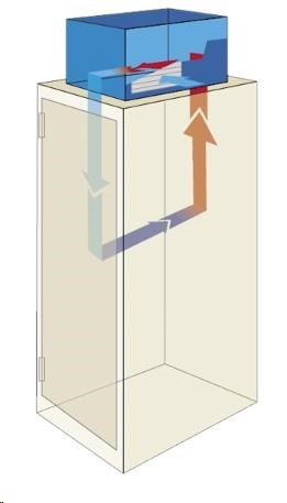 Vďaka tomuto usporiadaniu sa okolitý vzduch a vzduch cirkulujúci vo vnútri skrine nemiešajú, čím sa nezvyšuje vlhkosť vo vnútri skrine. Vlhkosť by mohla kondenzovať na povrchu nainštalovaného zariadenia a poškodiť ho alebo zamrznúť vo vnútri klimatizačného zariadenia, čo by mohlo spôsobiť jeho nefunkčnosť, ak by jednotka nebola správne nastavená. Preto je potrebné dbať na správne nastavenie jednotky s ohľadom na okolitú teplotu a vlhkosť. Na zníženie tohto rizika môže byť jednotka vybavená dverným kontaktom, ktorý automaticky vypne kompresor, keď sa otvoria dvere.