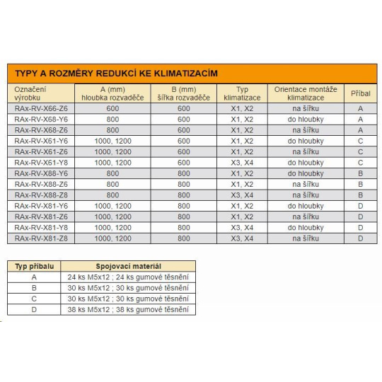 Aby bolo možné naplno využiť potenciál klimatizačných jednotiek nasmerovaním chladiaceho vzduchu presne podľa potrieb inštalovaných technológií, dodávame inštalačné redukcie na ich montáž na stojanové skrine radu RDE a RIE. Ide o kovový panel, ktorý je priskrutkovaný k veľkému otvoru v hornej časti skrine a na ktorom je umiestnená klimatizácia. Redukcie sú symetrické, takže zmena orientácie prúdenia vzduchu je možná pootočením redukcie. Rôzne veľkosti redukcií a orientáciu otvorov na chladiaci vzduch nájdete v tabuľke na tejto strane. Pre ľahký prístup k ovládaciemu panelu termostatu ho možno namontovať v 2 polohách jednoduchým zasunutím do konektora (pozri. inštalačná príručka).