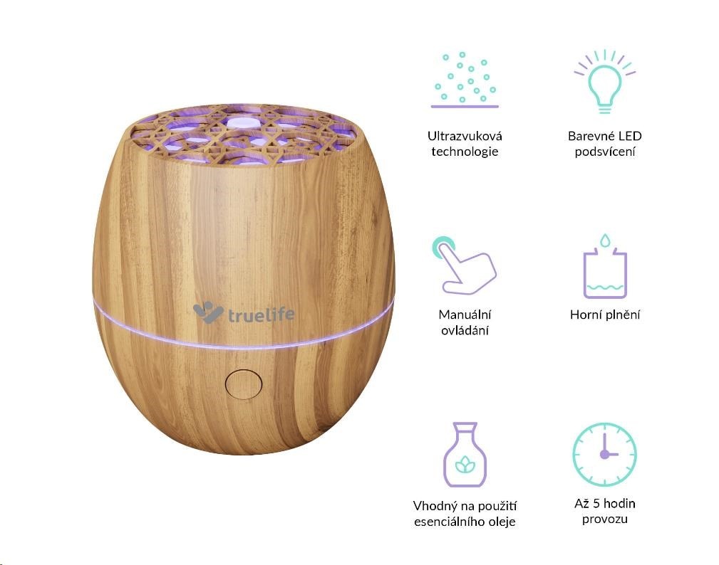Difuzér Truelife prevonia vzduch v miestnosti behom chvíľky, stačí do nádržky pridať pár kvapiek esenciálneho oleja. Či už ste milovníkmi aromaterapie, chcete si vytvoriť príjemnú relaxačnú atmosféru alebo vás trápia nepríjemné pachy z okolia, difuzér pre vás bude ideálnym pomocníkom. Funguje na princípe ultrazvuku, ktorý mení vodu v nádržke na jemnú paru. Na výber máte zo 7 variantov farebného LED podsvietenia. Poteší vás istotne aj svojim originálnym a aj napriek tomu nadčasovým dizajnom.
