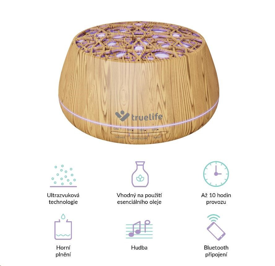 K navodeniu príjemnej atmosféry pomocou vône aj hudby vám bude stačiť jediný prístroj. Difuzér Truelife prevoní vzduch v miestnosti behom chvíľky, stačí do nádržky pridať pár kvapiek esenciálneho oleja. Vďaka Bluetooth konektivite jednoducho pripojíte difuzér k vášmu mobilnému telefónu a zo zabudovaného reproduktoru sa bude šíriť hudba podľa vašich predstáv. Difuzér funguje na princípe ultrazvuku, ktorý mení vodu v nádržke na jemnú paru. Na výber máte z 14 variant farebného LED podsvietenia. Poteší vás určite aj jeho kvalitný materiál a jedinečný dizajn.