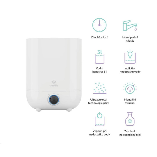 Ak vás doma trápi suchý vzduch, jednoduchým riešením je zvlhčovač TrueLife AIR Humidifier H3. Zvlhčovač vzduchu oceníte hlavne v vykurovacej sezóne, svoje uplatnenie ale nájde aj v lete. Vďaka hornému plneniu je obsluha zvlhčovača veľmi jednoduchá, nádrž nemusíte nikam prenášať, nerešíte rozliatu vodu pri každom použití. Funguje na princípe ultrazvuku, vodu v nádrži mení na jemnú paru, ktorá sa mieša so vzduchom a okamžite ho zvlhčuje. Výhodou ultrazvukovej technológie je okrem nízkej spotreby energie aj nízka hlučnosť, dosahujúca maximálne 35 dB. Zvlhčovač funguje aj ako difuzér. Stačí naplniť zásobník esenciálnym olejom a zvlhčovač provoní vďaka technológii OilFlow® miestnosť vašou obľúbenou vôňou.