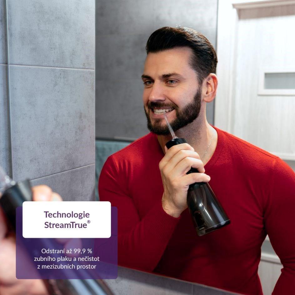Medzizubné priestory bývajú rajom baktérií, ktoré sú príčinou zubných kazov. Najúčinnejšie sa ich zbavíme každodenným čistením nielen zubov, ale práve aj priestoru medzi nimi. Špeciálne kefky či zubné nite nemusia byť práve komfortné a ich neustále nakupovanie pociťuje naša peňaženka. Šetrnejšie riešenie vo všetkých smeroch predstavuje ústna sprcha TrueLife AquaFloss Compact L100 Black disponujúca 3 režimami čistenia, predovšetkým režimom POINT, ktorý cielene a účinne odstráni zvyšky jedla z medzizubných priestorov. 300ml nádržka s dvojitým plnením, zhora aj z boku, pohodlne vystačí na dvojminútové čistenie, ktoré stráži integrovaný časovač. Praktické je potom plnenie nádržky zhora väčším otvorom, ktoré je oveľa rýchlejšie a jednoduchšie ako plnenie menšou dierkou z boku, ktorou štandardné ústne sprchy disponujú. Vďaka tomu je celá príprava aj používanie ústnej sprchy rýchlejšia a komfortnejšia. Dokonalú starostlivosť zaistí 6 trysiek pre rôzne dentálne potreby, od klasického čistenia cez čistenie jazyka a odstránenie povlaku až po ortodontické či periodontálne potreby. Na použitie sprchy nie je potrebné pripojenie do siete, jej batéria vydrží pri použití 2× denne až 14 dní. Vďaka svojmu kompaktnému riešeniu s vami sprcha môže aj cestovať. Prehľadný displej zobrazuje aktuálne nastavenie, funkcia pamäť zaisťuje, že sa po zapnutí spustí naposledy použitý režim.