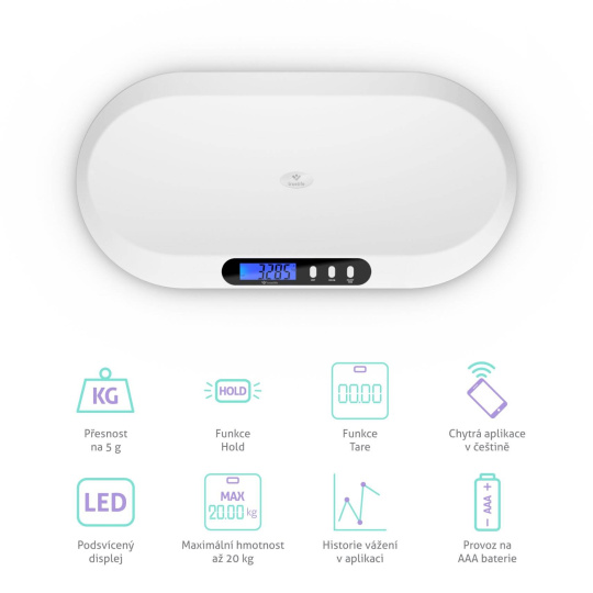 Stiahnite si smart aplikáciu, ktorá je dostupná kompletne v slovenčine, a sledujte rast a vývoj dieťaťa v čase. Aplikácia poskytuje prehľadnú históriu meraní, z ktorých vyplýva jasná informácia ako bábätko priberá a rastie. Zároveň dokáže z dát vytvoriť graf vývoja a jej prostredníctvom je možné ovládať funkcie TARE alebo HOLD. Váhu je možné používať ako s využitím aplikácie, tak aj bez nej.