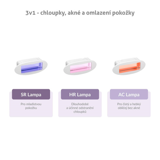 Epilátor TrueLife BELLE IPL EB5 využijete okrem samotnej epilácie aj k ďalším aplikáciám. Stačí len vymeniť lampu. K dlhodobému a účinnému odstráneniu chĺpkov vám poslúži HR lampa, ktorá je súčasťou balenia. Nejedného človeka trápi akné. Pokiaľ chce mať tvár čistú a hebkú na dotyk, odporúčame si zadovážiť AC lampu. Pokiaľ chcete svoju pokožku omladiť, pomôže vám s tým SR lampa. Všetky lampy sú súčasťou balenia. Nemusíte si teda nič dokupovať. Určite oceníte aj praktický stojanček.