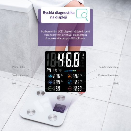 Na prehľadnom farebnom LCD displeji vidíte namerané hodnoty a je možné prepínať aj medzi jednotkami hmotnosti.
